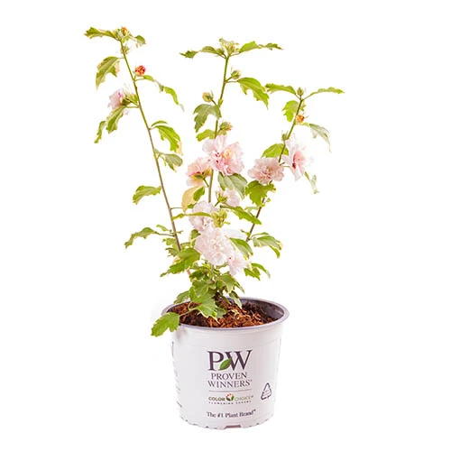 The soft pink, raspberry tinted petals give the double flowers a delicate look, yet it is completely hardy, and the eye-catching variegated grey-green foliage has unusual cream patterned edges. It makes a superb specimen in a large pot or grow it in the borders, where its height and unique foliage make it a perfect backdrop for other flowering plants.